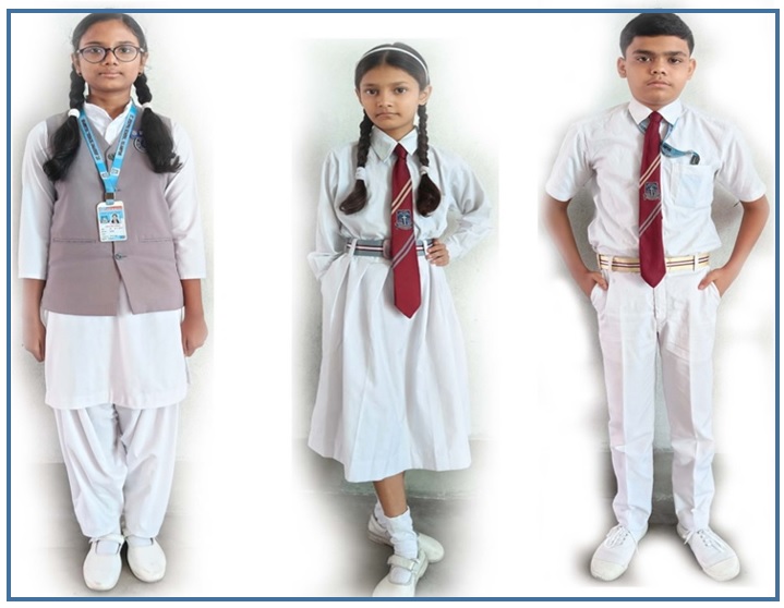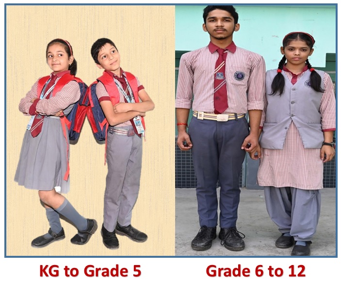 | KG to Grade 5: | Ash colour Pants, cream colour checked-shirt with maroon border shirt with school monogram, Black Shoes, ash colour socks, school tie and belt | Cream colour checked-shirt with maroon border, Ash colour – tunic with school monogram, Black shoes, ash colour socks, school tie and belt |